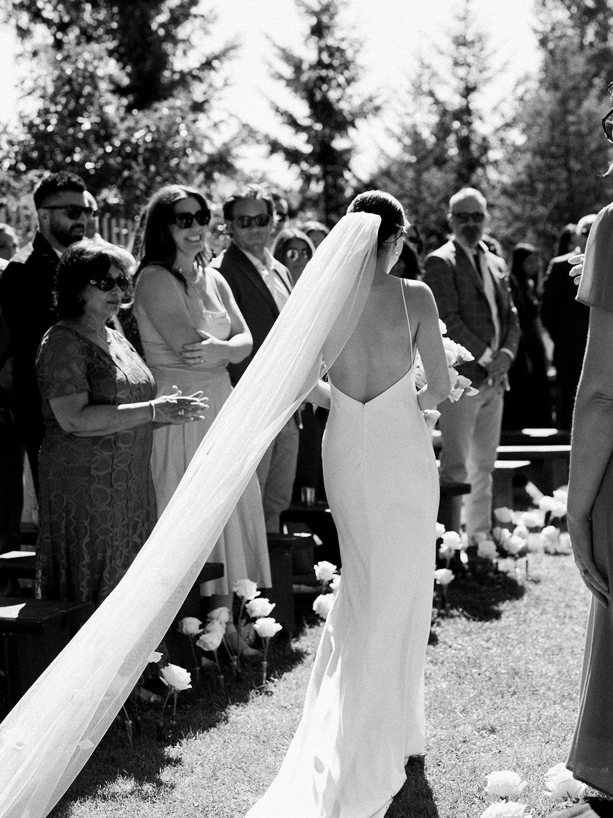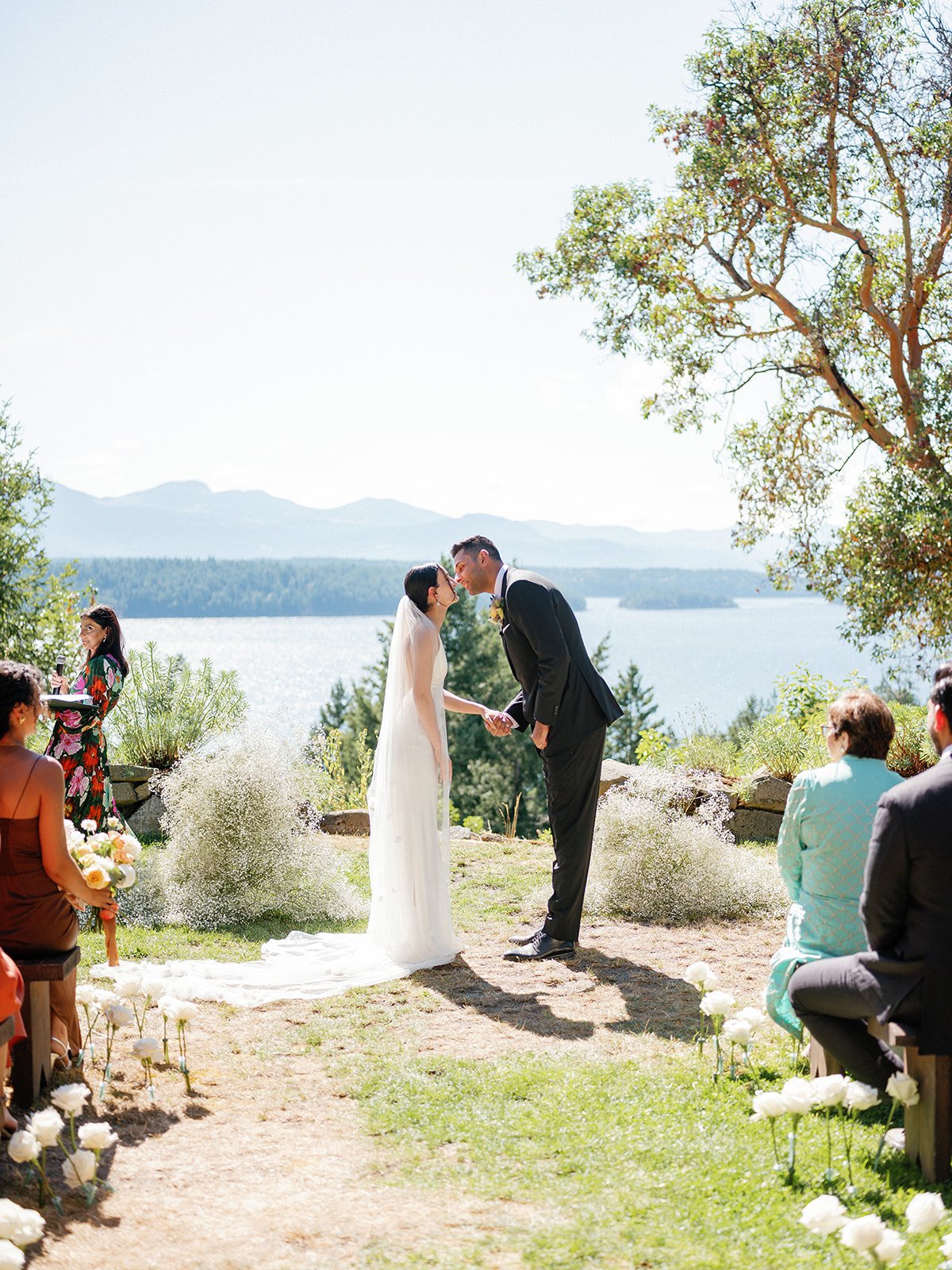 The ceremony took place at the top of Bodega Ridge, where sweeping views of the Southern Gulf Islands stretch endlessly in every direction. Rather than competing with the setting, Meetra and Amaan leaned into it, anchoring the ceremony with a single, striking gesture: an aisle of roses leading to the altar. Designed by Gossip Floral, the roses felt sculptural and intentional, guiding guests forward while still allowing the landscape to remain dominant. Against the rugged terrain and open sky, the florals felt modern rather than traditional - clean and effortless.